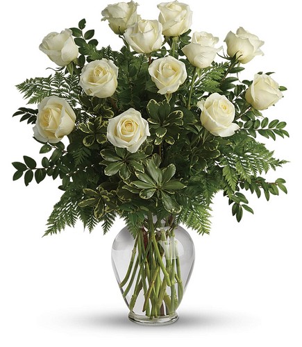 A joyful gesture of love and affection, this chic arrangement of one dozen pure white roses with fresh greens is a special surprise on any occasion.